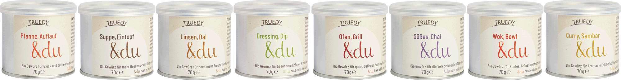 Alle erdenklichen Kochrichtungen sind angesprochen und alle Gerichte werden mit dieser „Grundausstattung“ bestens gewürzt. In den Rezepturen steckt viel Wissen und tausende Menschen durften herrliche Kostbarkeiten mit den &du-Mischungen genießen. Das intuitive Austauschen ist genauso möglich wie gewünscht: Dressing, Dip &du passt überall wo Kräuter gewünscht sind. Oder Suppe, Eintopf &du bringt herzhaften „Umami-Geschmack“ an jedes Gemüse ohne eine exotische Note. Die kannst du natürlich, wenn gewünscht, jederzeit im Kochvorgang ergänzen. Mit &du wirst du in deiner Individualität unterstützt. Wir möchten wir dich erinnern, dass du selbst bestimmen solltest. Jeder Mensch hat ein Gespür dafür hat, was ihm gut tut. Das darf gerne abweichen von pauschalen Empfehlungen. Würze beherzt, sei spontan, kreativ, ganz im Augenblick, &du hast es in der Hand.